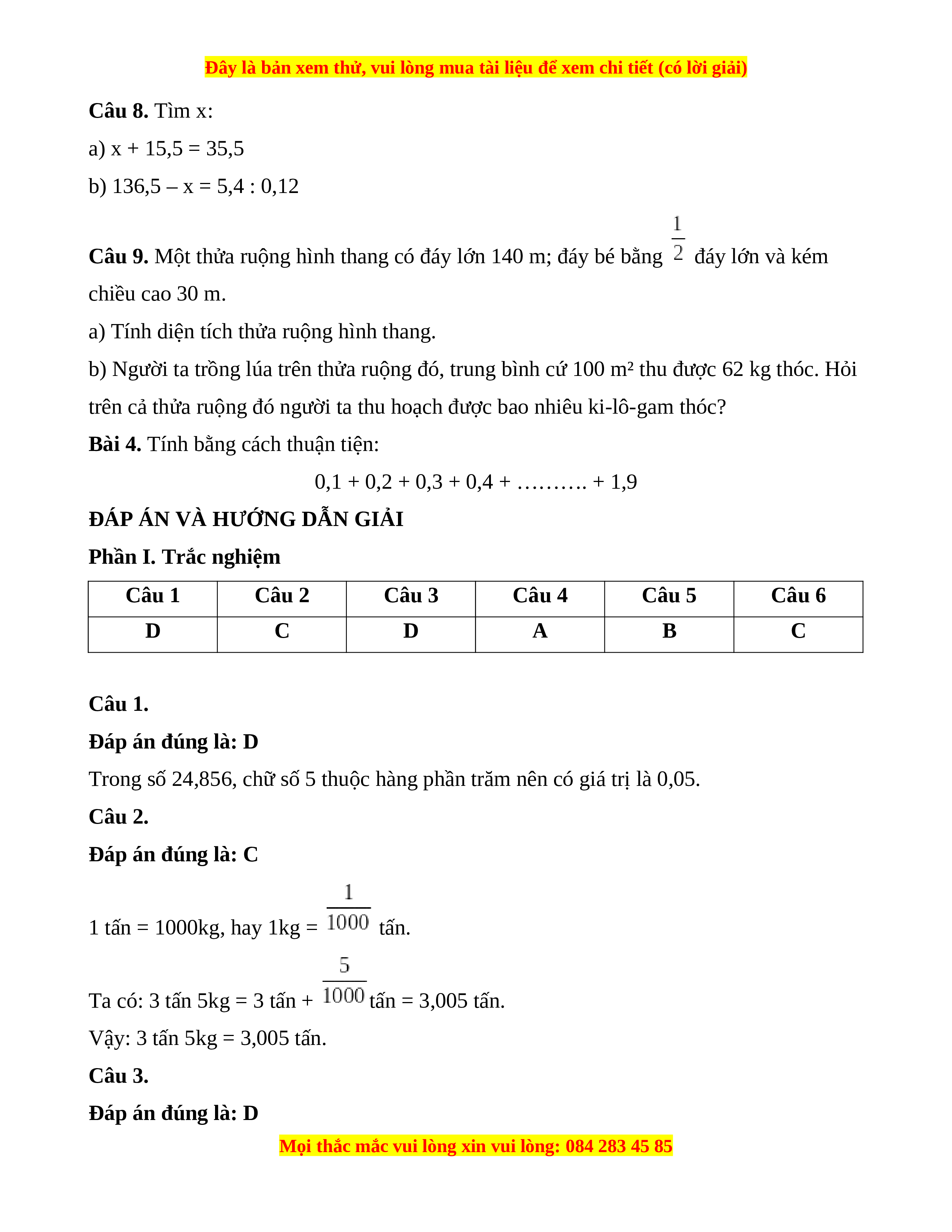 Vậy: 3 tấn 5kg = 3,005 tấn. Câu 3. Đáp án đúng là: D