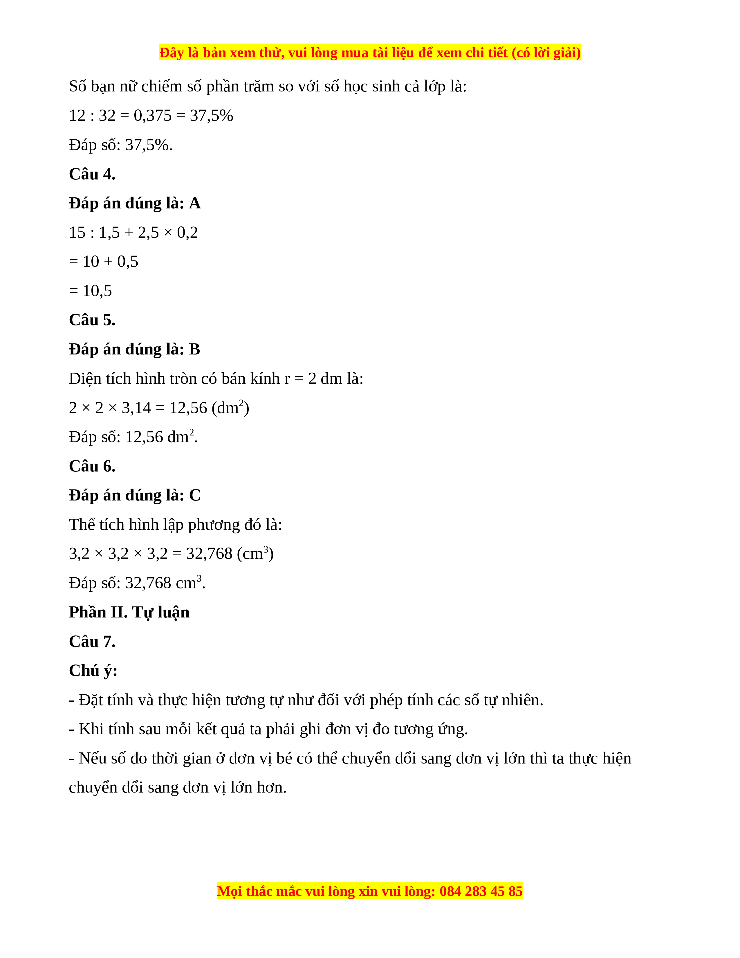 3,2 × 3,2 × 3,2 = 32,768 (cm3) Đáp số: 32,768 cm3. Phần II. Tự luận Câu 7. Chú ý: