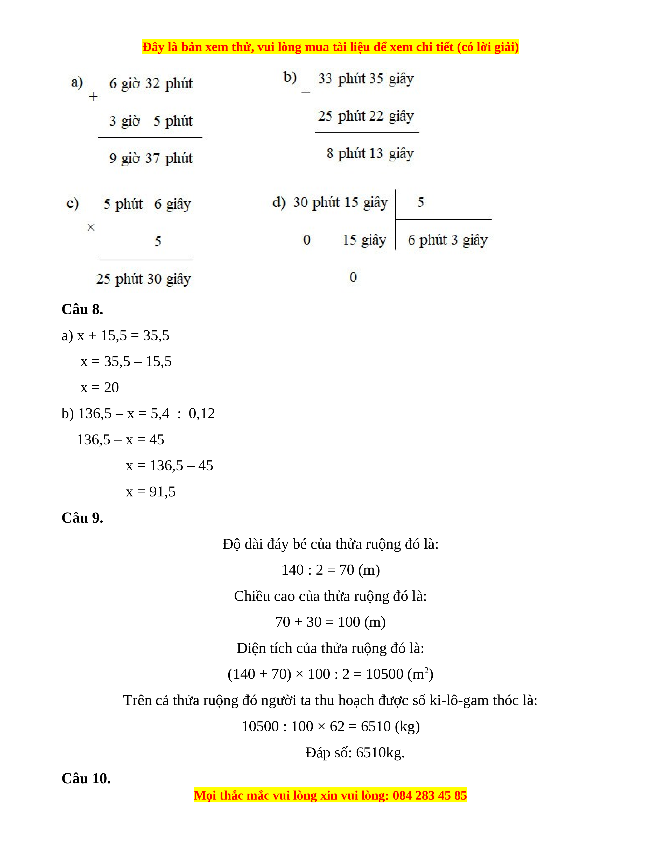 Câu 8. a) x + 15,5 = 35,5 x = 35,5 – 15,5 x = 20 b) 136,5 – x = 5,4 : 0,12 136,5 – x = 45 x = 136,5 – 45 x = 91,5 Câu 9.