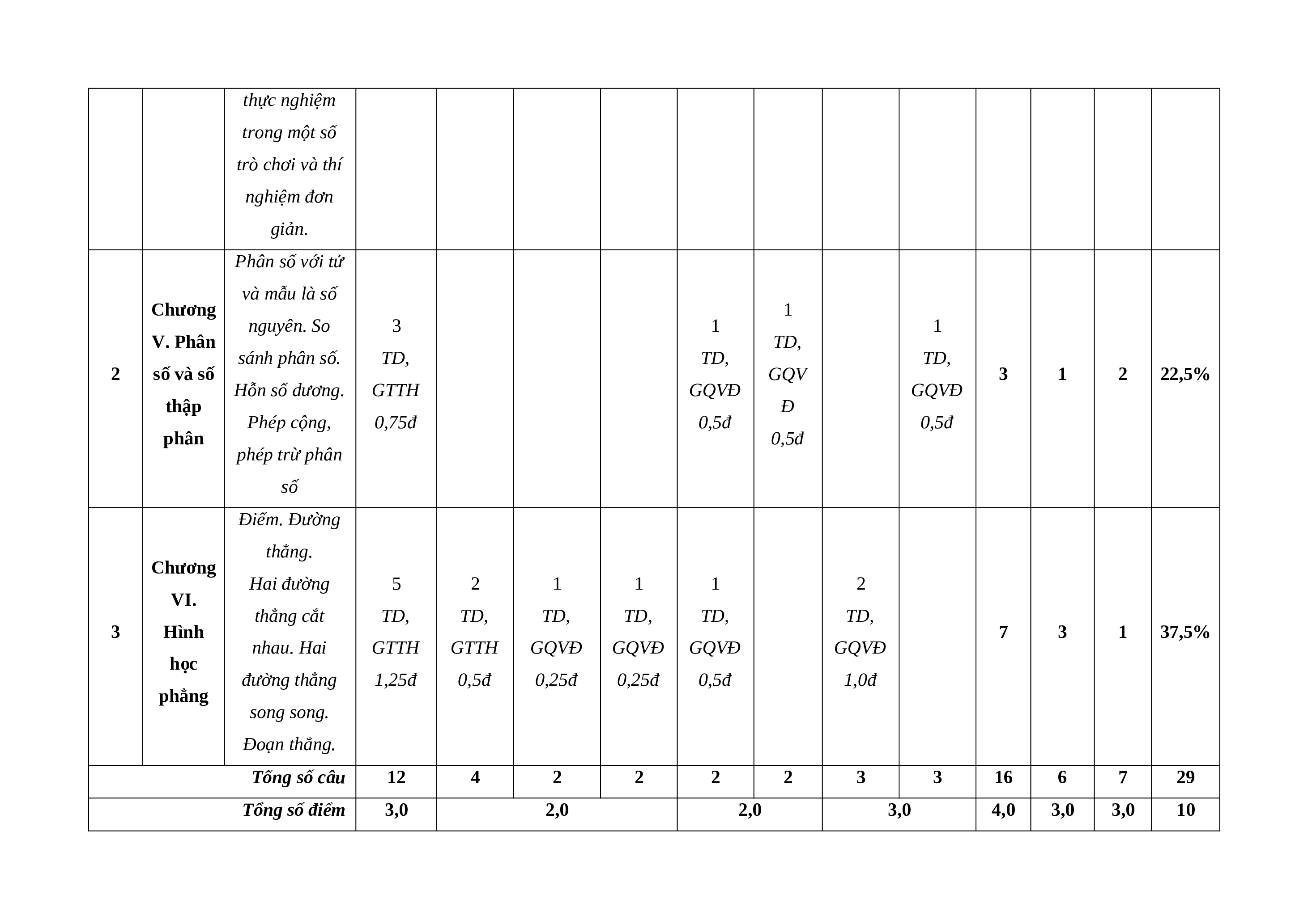 Số câu hỏi ở các mức độ đánh giá Tổng TNKQ Tự luận Tỉ lệ  Nội dung/  Nhiều  Chủ đề/  %  STT Đơn vị kiến  lựa  Đúng - Sai Trả lời ngắn Chương điểm thức chọn Vận  Vận  Vận  Vận  Biết Biết Hiểu Hiểu Hiểu Biết Hiểu Tổng dụng dụng dụng dụng 1 Chương  Thu thập, tổ  6 2 4 40% IV. Một  chức, biểu  2 2 1 1 1 1 số yếu  diễn, phân tích  TD,  TD,  TD,  TD,  TD,  TD,  tố  và xử lí dữ  GTTH GTTH GQVĐ GQVĐ GQVĐ GQVĐ thống  liệu. 0,5đ 0,5đ 0,25đ 0,25đ 0,5đ 0,5đ kê và  Biểu đồ cột  xác suất kép. Mô hình xác  2 1 1 suất trong một  TD,  TD,  TD,  số trò chơi và  GTTH GQV GQVĐ thí nghiệm đơn  0,5đ Đ 0,5đ giản. Xác suất  0,5đ thực nghiệm  trong một số  trò chơi và thí  nghiệm đơn  giản. Phân số với tử  và mẫu là số  Chương  1 nguyên. So  3 1 1 V. Phân  TD,  sánh phân số.  TD,  TD,  TD,  2 số và số  GQV 3 1 2 22,5% Hỗn số dương. GTTH GQVĐ GQVĐ thập  Đ Phép cộng,  0,75đ 0,5đ 0,5đ phân 0,5đ phép trừ phân  số Điểm. Đường  thẳng. Chương  Hai đường  5 2 1 1 1 2 VI.  thẳng cắt  TD,  TD,  TD,  TD,  TD,  TD,  3 Hình  7 3 1 37,5% nhau. Hai  GTTH GTTH GQVĐ GQVĐ GQVĐ GQVĐ học  đường thẳng  1,25đ 0,5đ 0,25đ 0,25đ 0,5đ 1,0đ phẳng song song. Đoạn thẳng. Tổng số câu 12 4 2 2 2 2 3 3 16 6 7 29