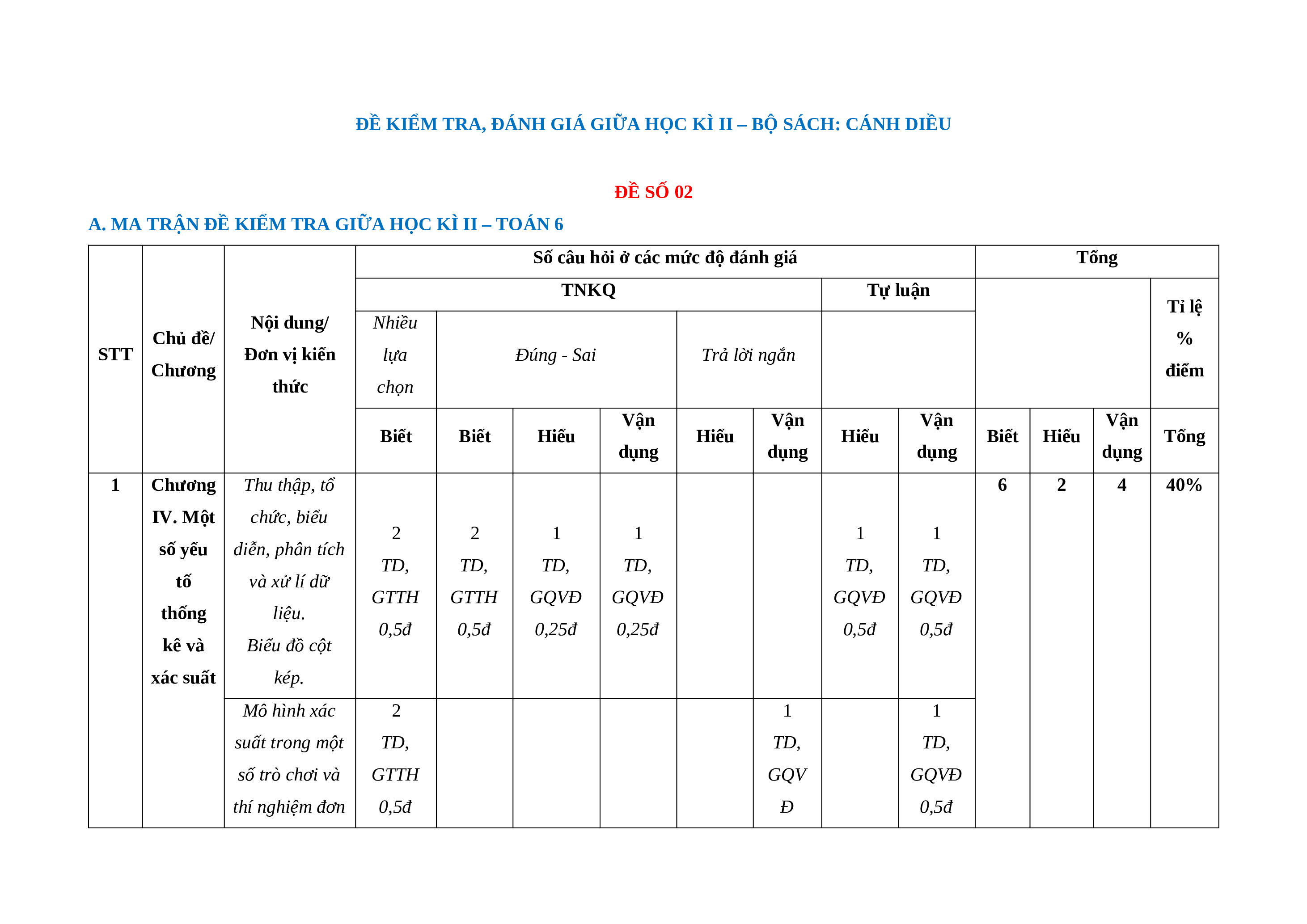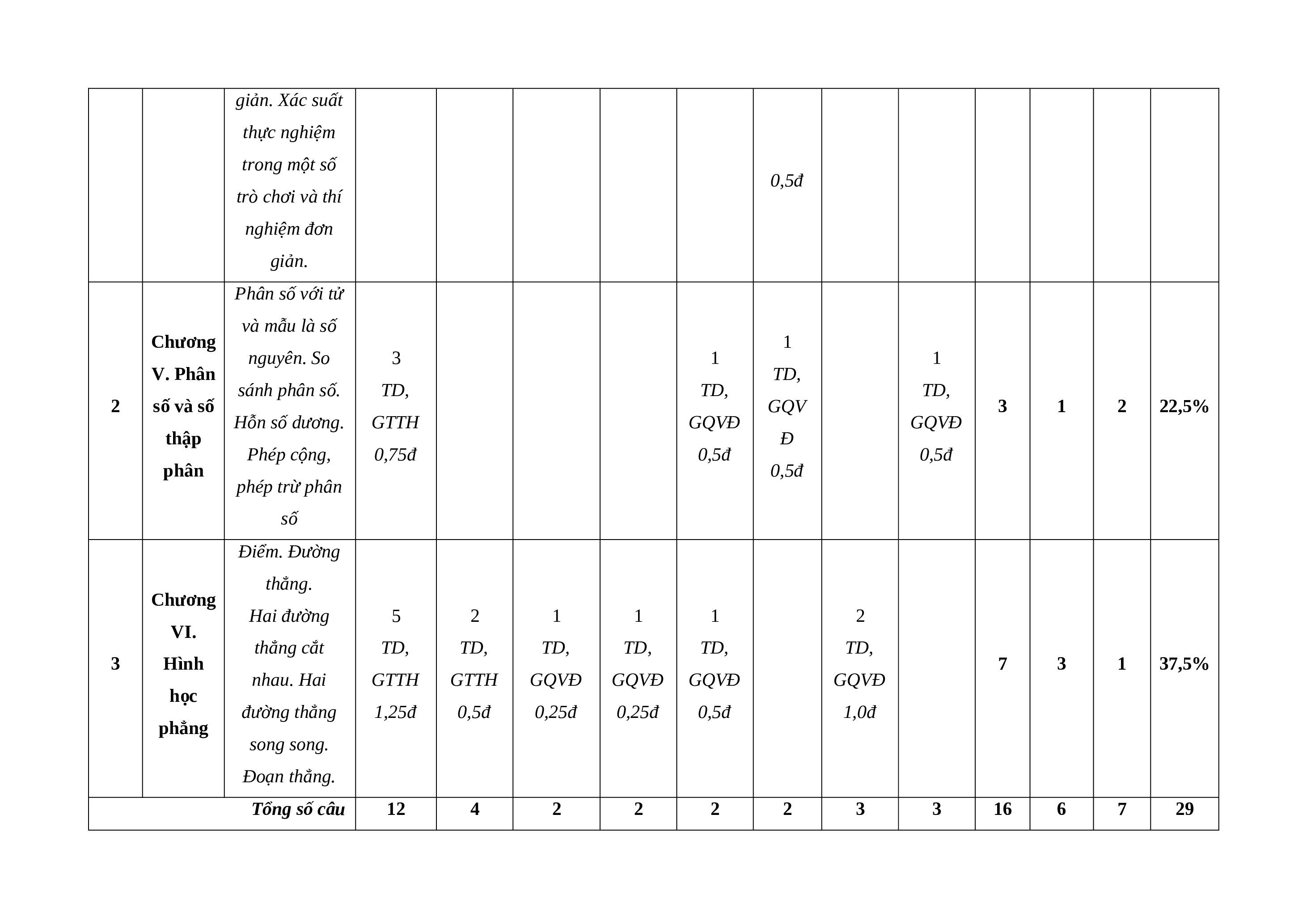 Số câu hỏi ở các mức độ đánh giá Tổng TNKQ Tự luận Tỉ lệ  Nội dung/  Nhiều  Chủ đề/  %  STT Đơn vị kiến  lựa  Đúng - Sai Trả lời ngắn Chương điểm thức chọn Vận  Vận  Vận  Vận  Biết Biết Hiểu Hiểu Hiểu Biết Hiểu Tổng dụng dụng dụng dụng 1 Chương  Thu thập, tổ  6 2 4 40% IV. Một  chức, biểu  2 2 1 1 1 1 số yếu  diễn, phân tích  TD,  TD,  TD,  TD,  TD,  TD,  tố  và xử lí dữ  GTTH GTTH GQVĐ GQVĐ GQVĐ GQVĐ thống  liệu. 0,5đ 0,5đ 0,25đ 0,25đ 0,5đ 0,5đ kê và  Biểu đồ cột  xác suất kép. Mô hình xác  2 1 1 suất trong một  TD,  TD,  TD,  số trò chơi và  GTTH GQV GQVĐ thí nghiệm đơn  0,5đ Đ 0,5đ giản. Xác suất  thực nghiệm  trong một số  0,5đ trò chơi và thí  nghiệm đơn  giản. Phân số với tử  và mẫu là số  Chương  1 nguyên. So  3 1 1 V. Phân  TD,  sánh phân số.  TD,  TD,  TD,  2 số và số  GQV 3 1 2 22,5% Hỗn số dương. GTTH GQVĐ GQVĐ thập  Đ Phép cộng,  0,75đ 0,5đ 0,5đ phân 0,5đ phép trừ phân  số Điểm. Đường  thẳng. Chương  Hai đường  5 2 1 1 1 2 VI.  thẳng cắt  TD,  TD,  TD,  TD,  TD,  TD,  3 Hình  7 3 1 37,5% nhau. Hai  GTTH GTTH GQVĐ GQVĐ GQVĐ GQVĐ học  đường thẳng  1,25đ 0,5đ 0,25đ 0,25đ 0,5đ 1,0đ phẳng song song. Đoạn thẳng. Tổng số câu 12 4 2 2 2 2 3 3 16 6 7 29