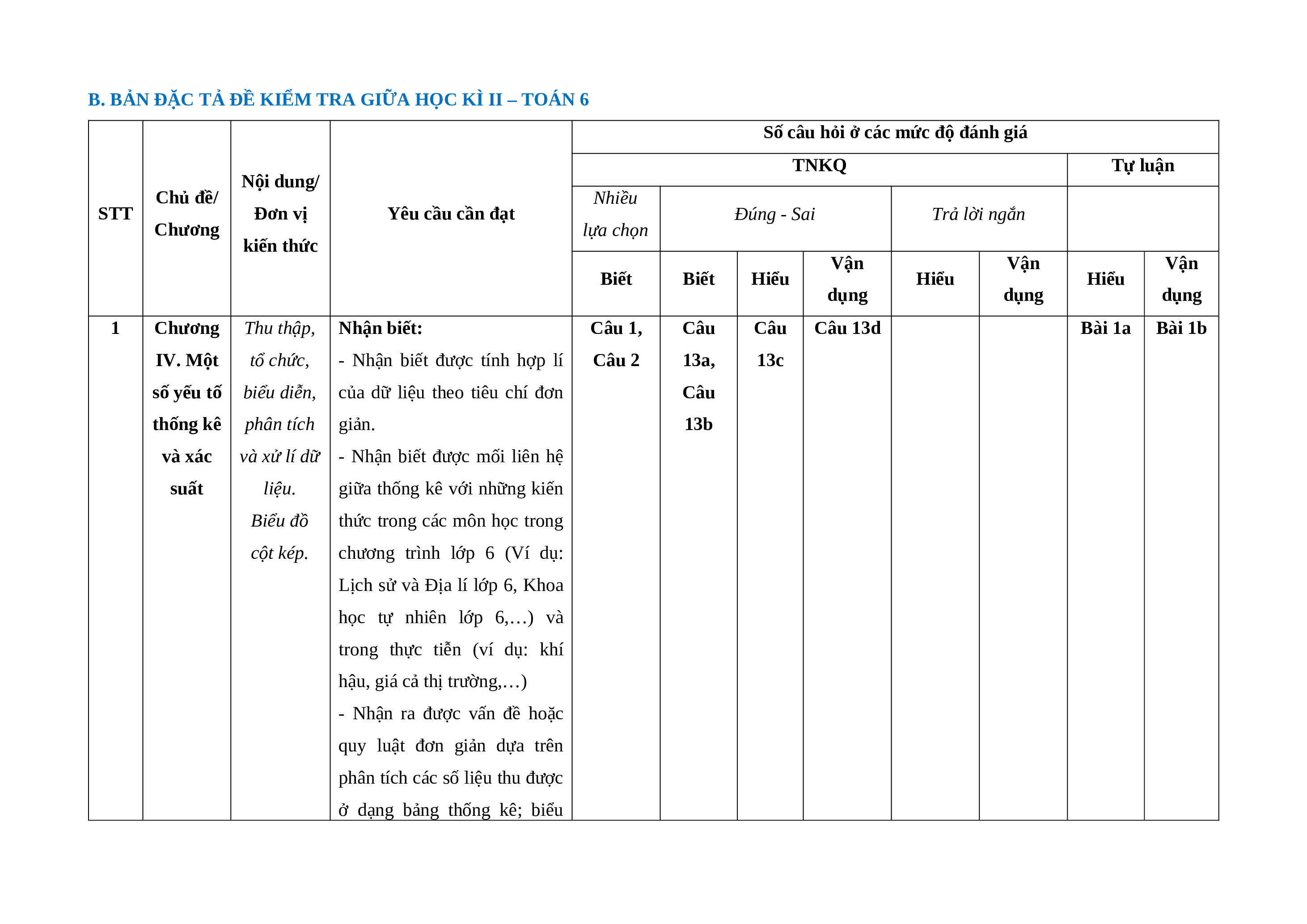 B. BẢN ĐẶC TẢ ĐỀ KIỂM TRA GIỮA HỌC KÌ II – TOÁN 6