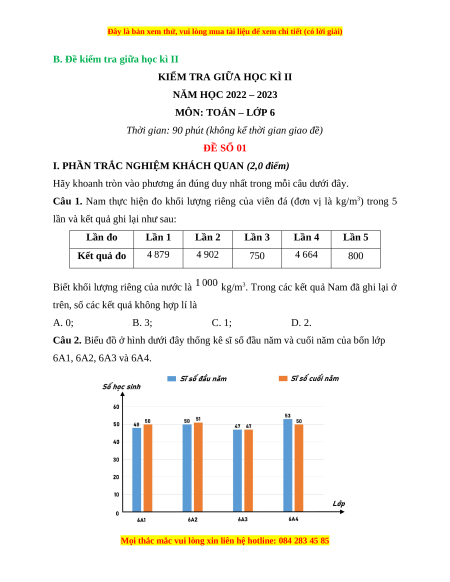 Câu 1. Nam thực hiện đo khối lượng riêng của viên đá (đơn vị là kg/m3) trong 5
