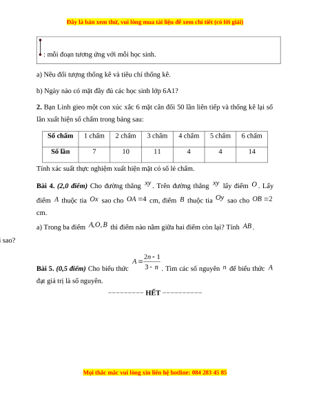2. Bạn Linh gieo một con xúc xắc 6 mặt cân đối 50 lần liên tiếp và thống kê lại số