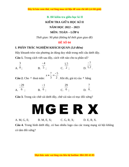 II. Hướng dẫn giải chi tiết trắc nghiệm Câu 1. Đáp án đúng là: B Phân số có dạng với . Do đó, cách viết là cách viết phân số. Câu 2. Đáp án đúng là: A Vậy . Câu 3. Đáp án đúng là: B