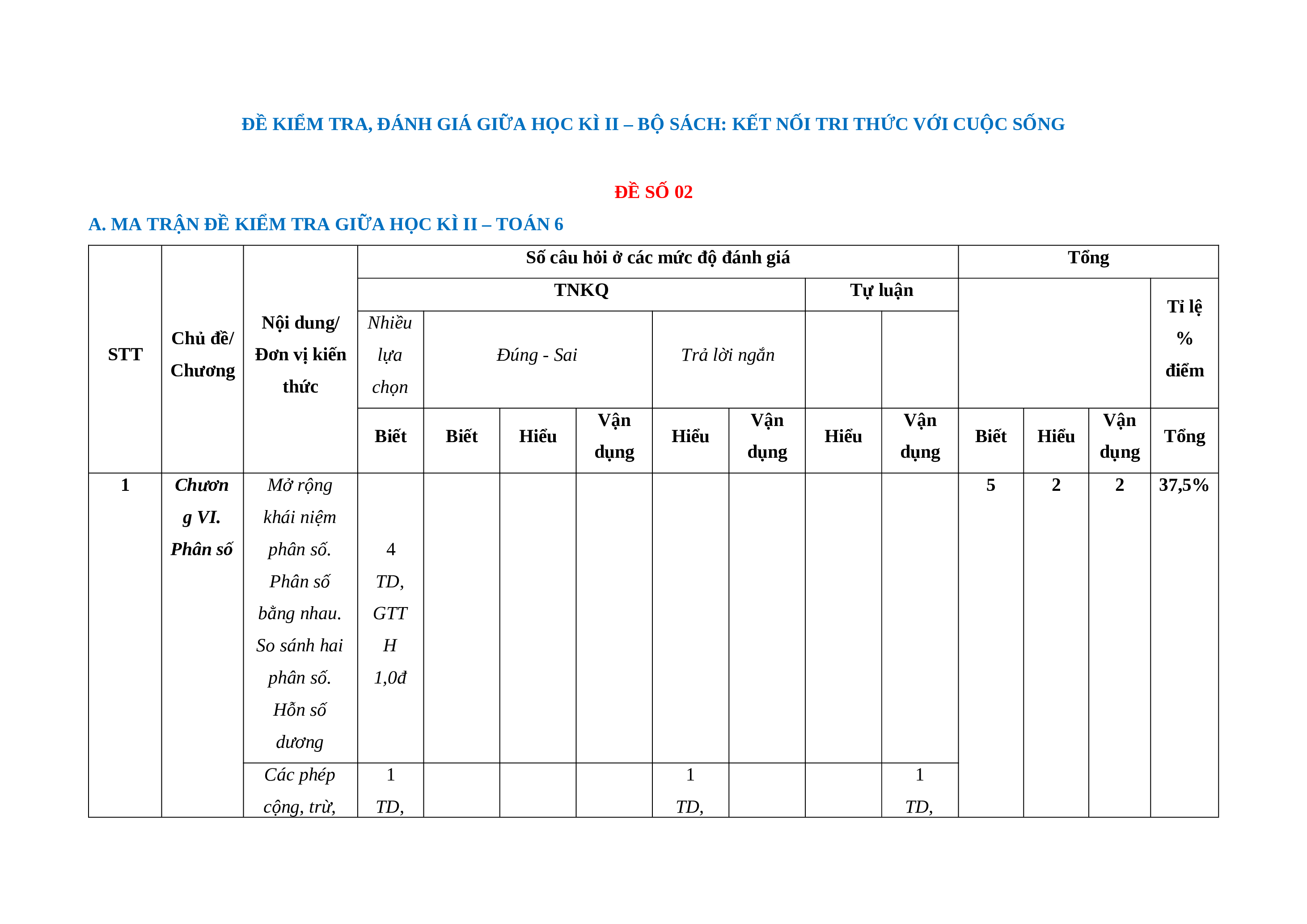 A. MA TRẬN ĐỀ KIỂM TRA GIỮA HỌC KÌ II – TOÁN 6