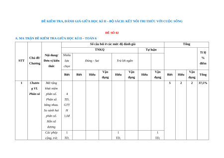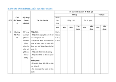 Số câu hỏi ở các mức độ đánh giá Tổng TNKQ Tự luận Tỉ lệ Nội dung/ Nhiều Chủ đề/ % STT Đơn vị kiến lựa Đúng - Sai Trả lời ngắn Chương điểm thức chọn Vận Vận Vận Vận Biết Biết Hiểu Hiểu Hiểu Biết Hiểu Tổng dụng dụng dụng dụng 1 Chươn Mở rộng 5 2 2 37,5% g VI. khái niệm Phân số phân số. 4 Phân số TD, bằng nhau. GTT So sánh hai H phân số. 1,0đ Hỗn số dương Các phép 1 1 1 cộng, trừ, TD, TD, TD, GTT nhân, chia GQVĐ GQVĐ H phân số. 0,5đ 0,5đ 0,25đ 1 1 TD, Hai bài toán TD, GQVĐ, về phân số. GQVĐ MHH 0,5đ 1,0đ Số thập 1 3 phân. Tính TD, TD, toán với số GQVĐ GTT Chươn thập phân. 0,5đ H g VII. Làm tròn và 2 0,75đ 5 2 2 27,5% Số thập ước lượng phân Một số bài 2 1 1 1 toán về tỉ số TD, TD, TD, TD, và tỉ số GTTH GQVĐ GQVĐ GQVĐ phần trăm. 0,5đ 0,25đ 0,25đ 0,5đ 3 Chươn Điểm và 2 2 1 1 6 3 2 35% g VIII. đường TD, TD, TD, TD,