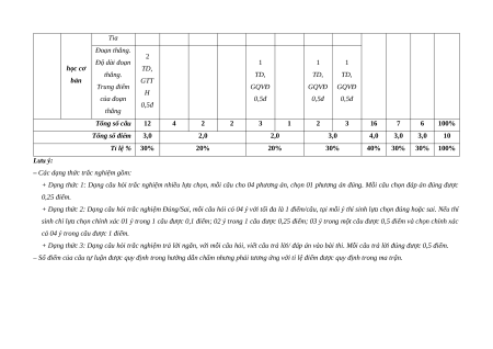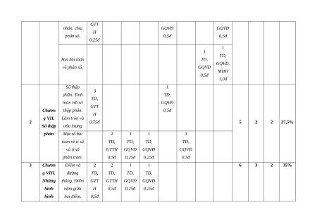 Những thẳng. Điểm GTT GTTH GQVĐ GQVĐ hình nằm giữa H 0,5đ 0,25đ 0,25đ hình hai điểm. 0,5đ Tia Đoạn thẳng. 2 Độ dài đoạn 1 1 1 học cơ TD, thẳng. TD, TD, TD, bản GTT Trung điểm GQVĐ GQVĐ GQVĐ H của đoạn 0,5đ 0,5đ 0,5đ 0,5đ thẳng Tổng số câu 12 4 2 2 3 1 2 3 16 7 6 100%