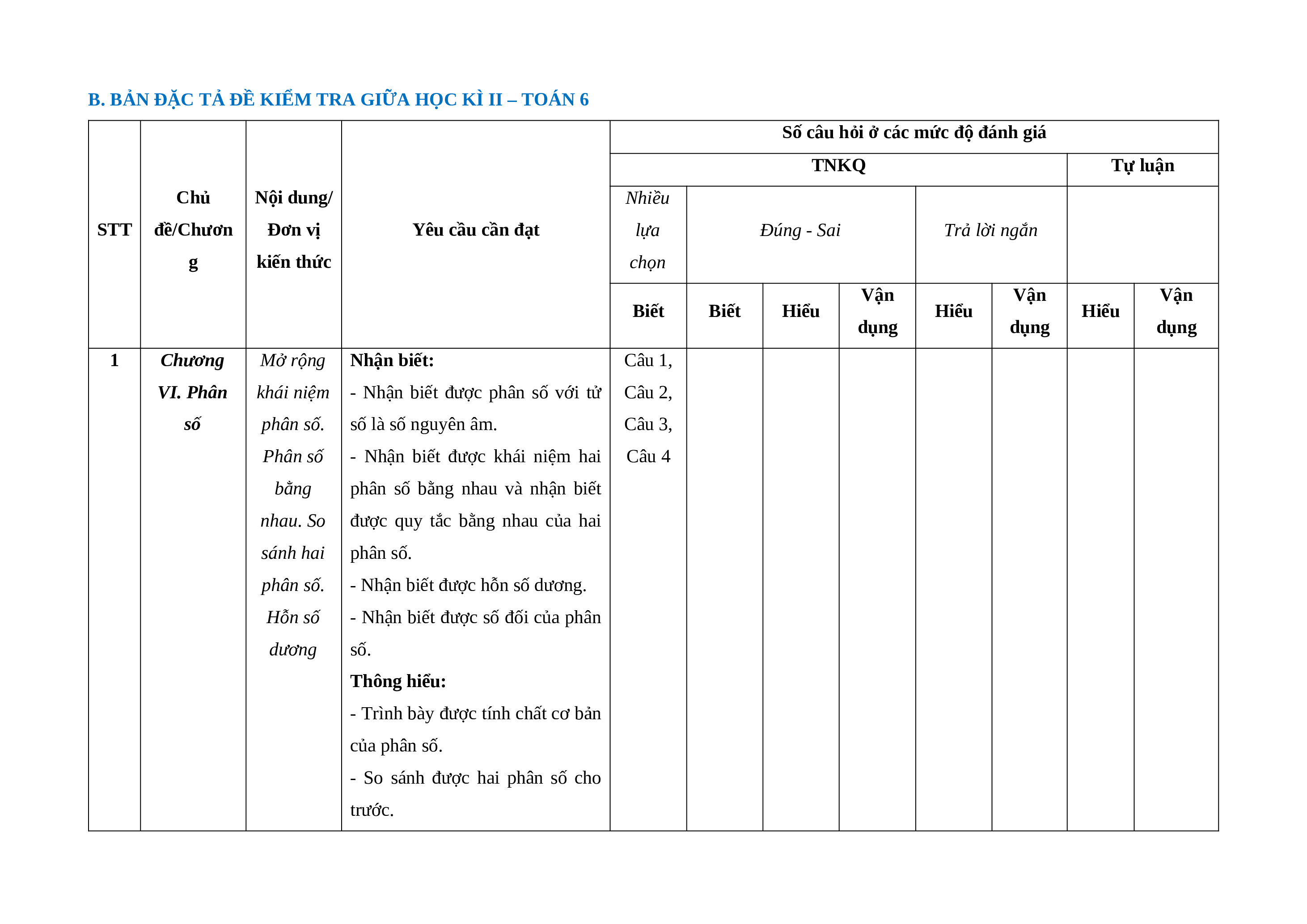 B. BẢN ĐẶC TẢ ĐỀ KIỂM TRA GIỮA HỌC KÌ II – TOÁN 6