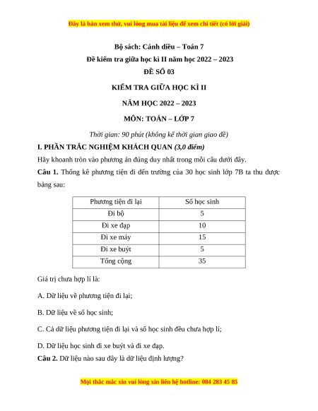 - Tailieugiaovien.com.vn giới thiệu bộ đề giữa học kì 2 Toán 7 bộ Cánh diều mới nhất nhằm giúp Giáo viên có thêm tài liệu tham khảo ra đề thi Toán lớp 7.