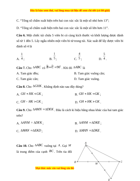 . Đâu là cách kí hiệu bằng nhau khác của hai tam giác trên? A. ; B. ; C. ; D. . Câu 10. Cho vuông tại . Gọi
