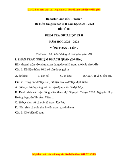 Đề thi giữa kì 2 Toán 7 Cánh diều có đáp án (Đề 5)