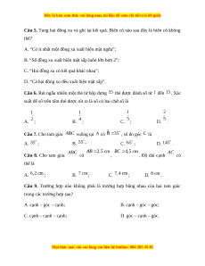 suất để số trên tấm thẻ được rút ra là số có hai chữ số là A. ; B. ; C. ; D. . Câu 7. Cho tam giác vuông tại có , số đo góc là A. ; B. C. ; D. . Câu 8. Cho tam giác có , . Độ dài cạnh có thể là A. ; B. ; C. ; D. .