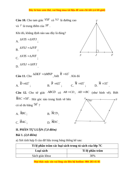 Câu 9. Trường hợp nào không phải là trường hợp bằng nhau của hai tam giác