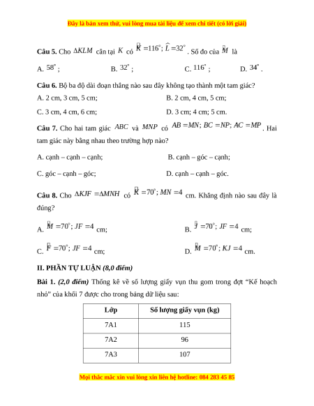Câu 6. Bộ ba độ dài đoạn thẳng nào sau đây không tạo thành một tam giác? A. 2 cm, 3 cm, 5 cm; B. 2 cm, 4 cm, 5 cm; C. 3 cm, 4 cm, 6 cm; D. 3 cm; 4 cm; 5 cm.