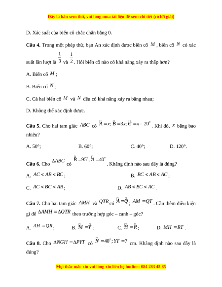 Câu 5. Cho hai tam giác có . Khi đó, bằng bao nhiêu? A. 50°; B. 60°; C. 40°; D. 120°. Câu 6. Cho có