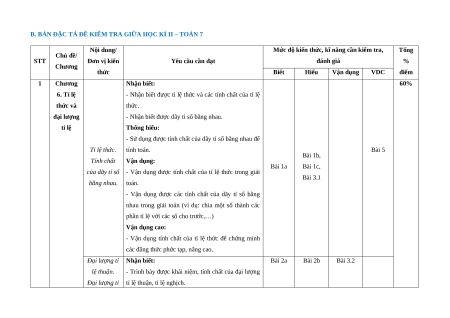 B. BẢN ĐẶC TẢ ĐỀ KIỂM TRA GIỮA HỌC KÌ II – TOÁN 7 Nội dung/