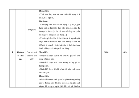 Mức độ kiến thức, kĩ năng cần kiểm tra, Tổng Chủ đề/ STT Đơn vị kiến Yêu cầu cần đạt đánh giá % Chương thức Biết Hiểu Vận dụng VDC điểm 1 Chương Nhận biết: 60% 6. Tỉ lệ