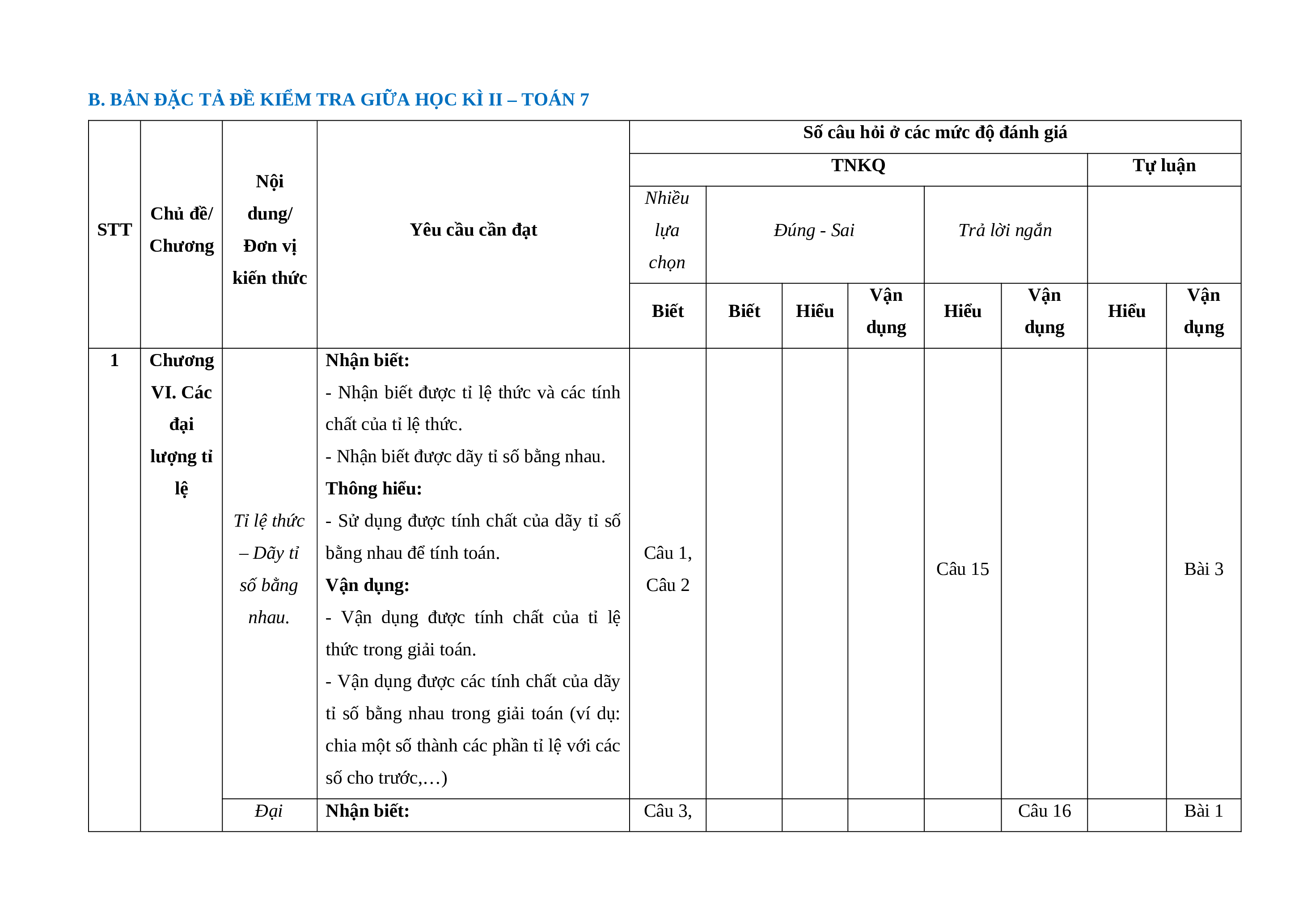 B. BẢN ĐẶC TẢ ĐỀ KIỂM TRA GIỮA HỌC KÌ II – TOÁN 7
