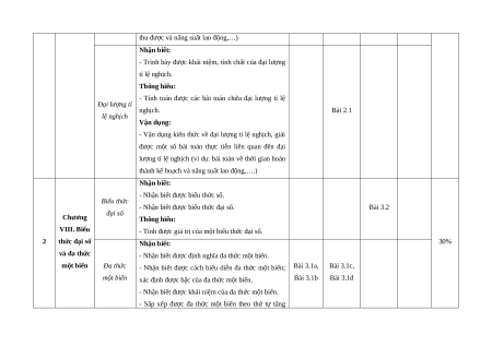 - Tính được giá trị của một biểu thức đại số. 2 thức đại số 30% Nhận biết: và đa thức