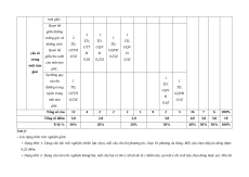 Quan hệ cạnh đối diện GTTH giữa các trong một 0,25đ tam giác. Quan hệ giữa đường 2 1 1 vuông góc và 2 1 TD, TD, TD, đường xiên. TD, TD, GTT GQV GQV Quan hệ GTTH GQVĐ yếu tố H Đ Đ giữa ba cạnh 0,5đ 0,25đ trong 0,5đ 0,25đ 0,5đ của một tam một tam giác. giác Sự đồng quy 1 của ba 1 1 TD, đường trung TD, TD, GQV tuyến trong GTTH GQVĐ Đ một tam 0,25đ 0,5đ 0,5đ giác. Tổng số câu 12 4 2 2 2 1 0 2 3 16 7 6 100% Tổng số điểm 3,0 2,0 2,0 3,0 4,0 3,0 3,0 10 Tỉ lệ % 30% 20% 20% 30% 40% 30% 30% 100% Lưu ý: