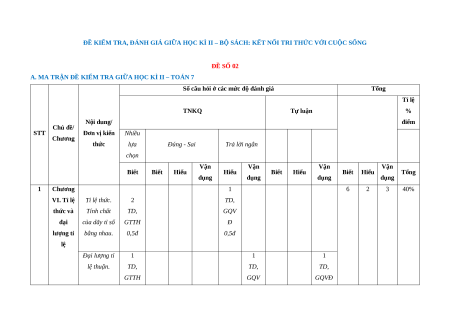 Số câu hỏi ở các mức độ đánh giá Tổng Tỉ lệ TNKQ Tự luận % Nội dung/ điểm Chủ đề/ STT Đơn vị kiến Nhiều Chương thức lựa Đúng - Sai Trả lời ngắn chọn Vận Vận Vận Vận Biết Biết Hiểu Hiểu Biết Hiểu Biết Hiểu Tổng dụng dụng dụng dụng 1 Chương 1 6 2 3 40% VI. Tỉ lệ Tỉ lệ thức. 2 TD, thức và Tính chất TD, GQV đại