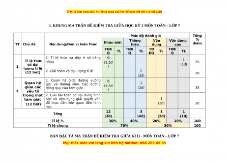 1. KHUNG MA TRẬN ĐỀ KIỂM TRA GIỮA HỌC KỲ 2 MÔN TOÁN – LỚP 7
