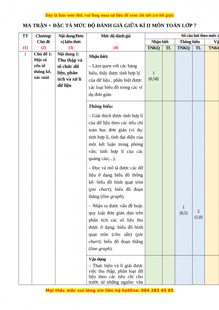 MA TRẬN + ĐẶC TẢ MỨC ĐỘ ĐÁNH GIÁ GIỮA KÌ II MÔN TOÁN LỚP 7 TT Chương/ Nội dung/Đơn Mức độ đánh giá
