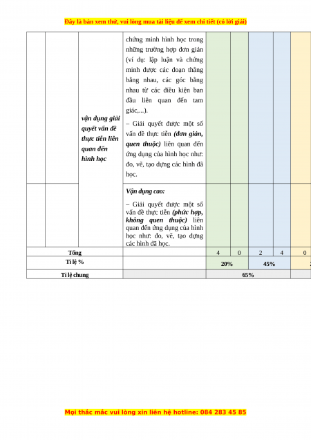 học như: đo, vẽ, tạo dựng các hình đã học. Tổng 4 0 2 4 0 Tỉ lệ % 20% 45% 25% Tỉ lệ chung 65%