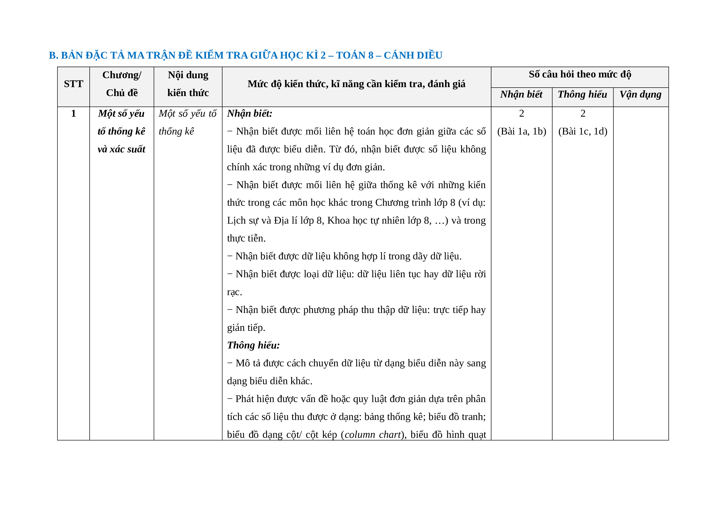 B. BẢN ĐẶC TẢ MA TRẬN ĐỀ KIỂM TRA GIỮA HỌC KÌ 2 – TOÁN 8 – CÁNH DIỀU Chương/ Nội dung