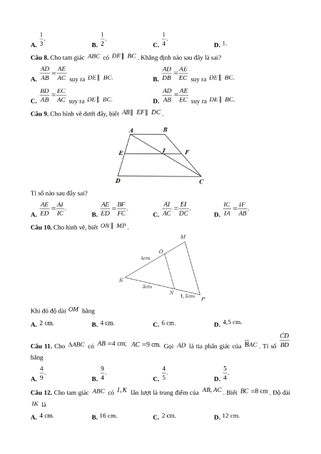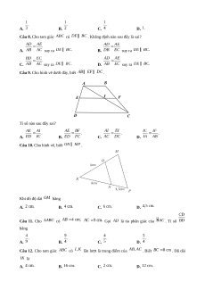 Câu 10. Cho hình vẽ, biết . Khi đó độ dài bằng A. B. C. D. Câu 11. Cho có Gọi là tia phân giác của . Tỉ số bằng A. B. C. D. Câu 12. Cho tam giác có