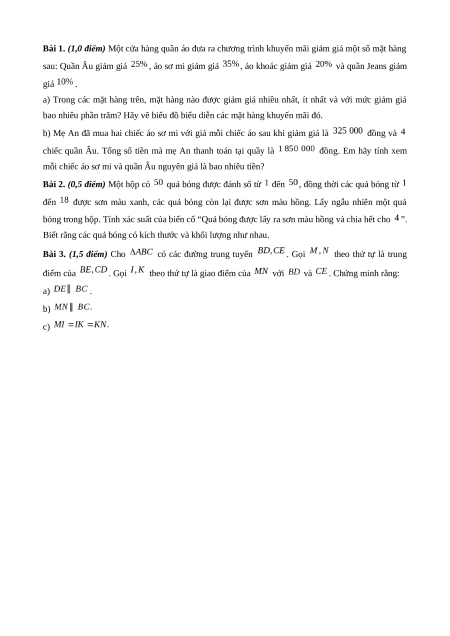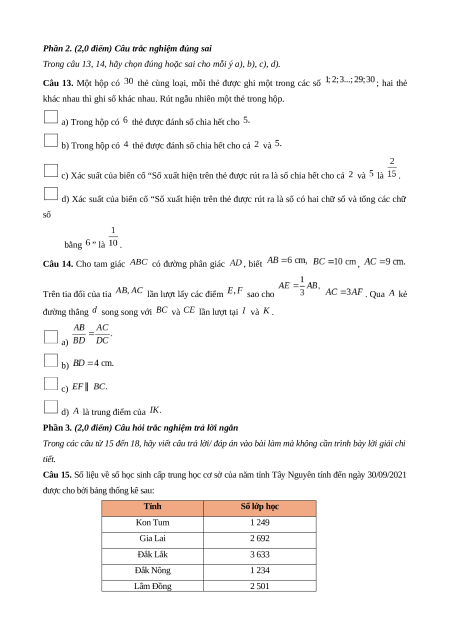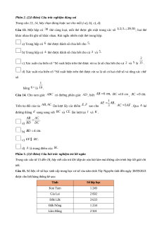 d) Xác suất của biến cố “Số xuất hiện trên thẻ được rút ra là số có hai chữ số và tổng các chữ số bằng ” là . Câu 14. Cho tam giác có đường phân giác , biết , Trên tia đối của tia