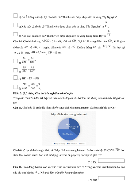 Phần 3. (2,0 điểm) Câu hỏi trắc nghiệm trả lời ngắn