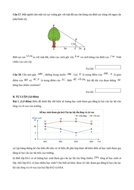 và cách bóng của đỉnh cọc Tính chiều cao của cây Trả lời: Câu 18. Cho tam giác , đường trung tuyến . Gọi là trung điểm của là giao điểm của và là trung điểm của . Biết