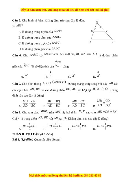 D. là đường phân giác của Câu 6. Cho có là đường phân giác của Tỉ số diện tích của bằng A. B. C. D.