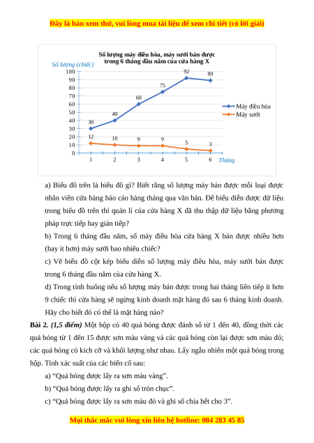 trong 6 tháng đầu năm của cửa hàng X Số lượng (chiếc) 100 92 89 90 80 75 70 60 60 Máy điều hòa 50 40 Máy sưởi 40 30 30 20 12 10 9 9 10 5 3 0 1 2 3 4 5 6 Tháng