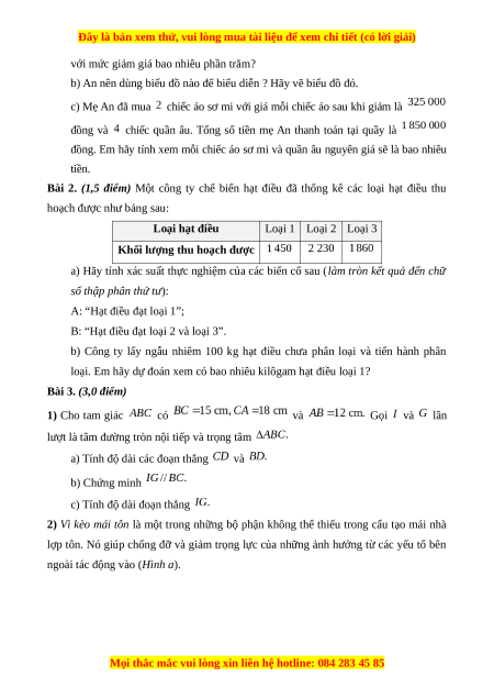 Bài 2. (1,5 điểm) Một công ty chế biến hạt điều đã thống kê các loại hạt điều thu