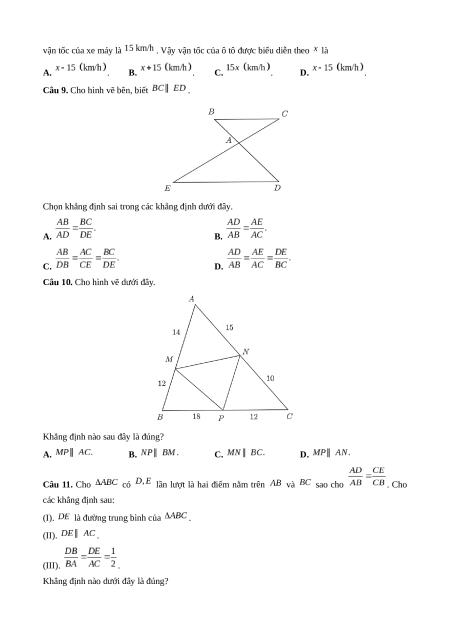 Câu 8. Xe máy đi từ đến với vận tốc (km/h). Ô tô đi từ về với vận tốc nhanh hơn vận tốc của xe máy là