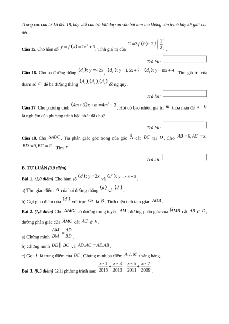 Câu 16. Cho ba đường thẳng , , . Tìm giá trị của tham số để ba đường thẳng đồng quy. Trả lời: