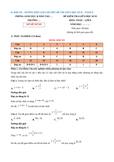 ĐỀ KIỂM TRA GIỮA HỌC KÌ II TRƯỜNG … MÔN: TOÁN – LỚP 8 MÃ ĐỀ MT103 NĂM HỌC: … – … Thời gian: 90 phút
