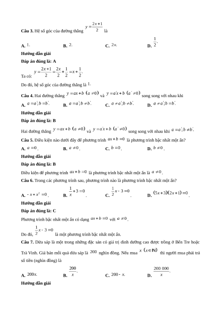 Câu 6. Trong các phương trình sau, phương trình nào là phương trình bậc nhất một ẩn? A. . B. . C. . D. .