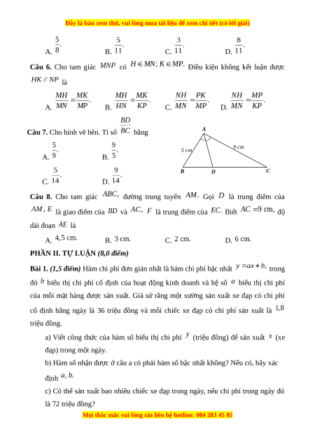 Câu 7. Cho hình vẽ bên. Tỉ số bằng A 9 cm 5 cm A. B. B D C C. D. Câu 8. Cho tam giác đường trung tuyến Gọi là trung điểm của là giao điểm của và là trung điểm của Biết độ dài đoạn là A. B. C. D.