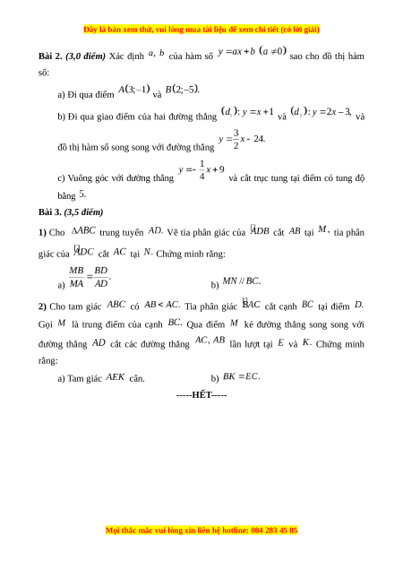 Bài 2. (3,0 điểm) Xác định của hàm số sao cho đồ thị hàm số: a) Đi qua điểm và