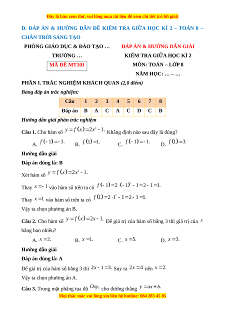 D. ĐÁP ÁN & HƯỚNG DẪN ĐỀ KIỂM TRA GIỮA HỌC KÌ 2 – TOÁN 8 –