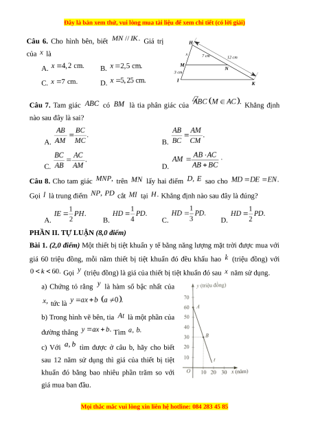 Câu 6. Cho hình bên, biết Giá trị H của là x 7 cm 12 cm A. B. M N 3 cm C. D. I K Câu 7. Tam giác có là tia phân giác của Khẳng định nào sau đây là sai? A. B. C. D. Câu 8. Cho tam giác trên lấy hai điểm sao cho Gọi là trung điểm cắt tại