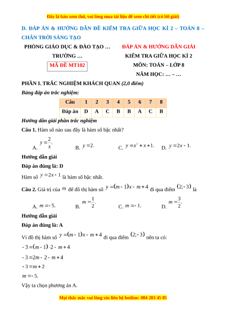 D. ĐÁP ÁN & HƯỚNG DẪN ĐỀ KIỂM TRA GIỮA HỌC KÌ 2 – TOÁN 8 –