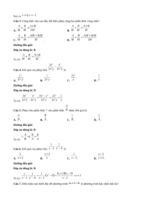 Câu 3. Công thức nào sau đây thể hiện phép cộng hai phân thức cùng mẫu? A. . B. . C. . D. .