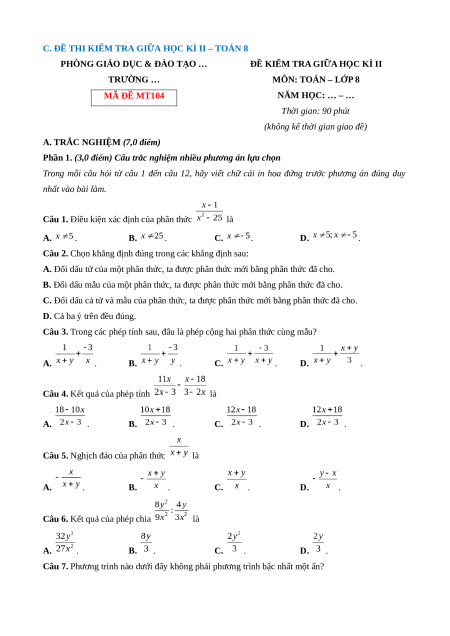 ĐỀ KIỂM TRA GIỮA HỌC KÌ II TRƯỜNG … MÔN: TOÁN – LỚP 8 MÃ ĐỀ MT104 NĂM HỌC: … – … Thời gian: 90 phút
