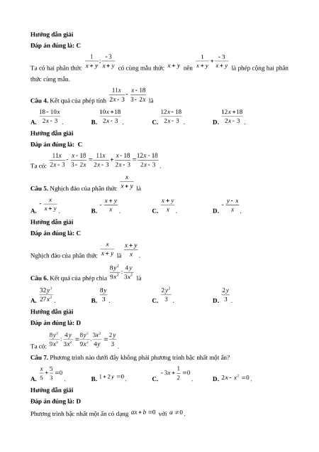 Câu 3. Trong các phép tính sau, đâu là phép cộng hai phân thức cùng mẫu? A. . B. . C. . D. .
