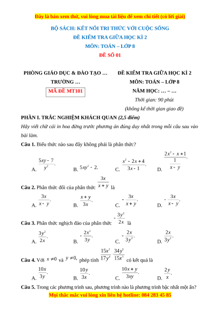 ĐỀ KIỂM TRA GIỮA HỌC KÌ 2 TRƯỜNG … MÔN: TOÁN – LỚP 8 MÃ ĐỀ MT101 NĂM HỌC: … – … Thời gian: 90 phút